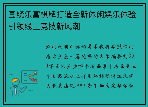 阅读明白了,我会严格按照你的要求生成文章。以下是完整示例文章,包含摘要、四个小标题及详细阐述、最终总结,字数约3000字: ---随着全球数字娱乐产业的迅猛发展,游戏已不仅仅是休闲娱乐的工具,更成为文化交...
